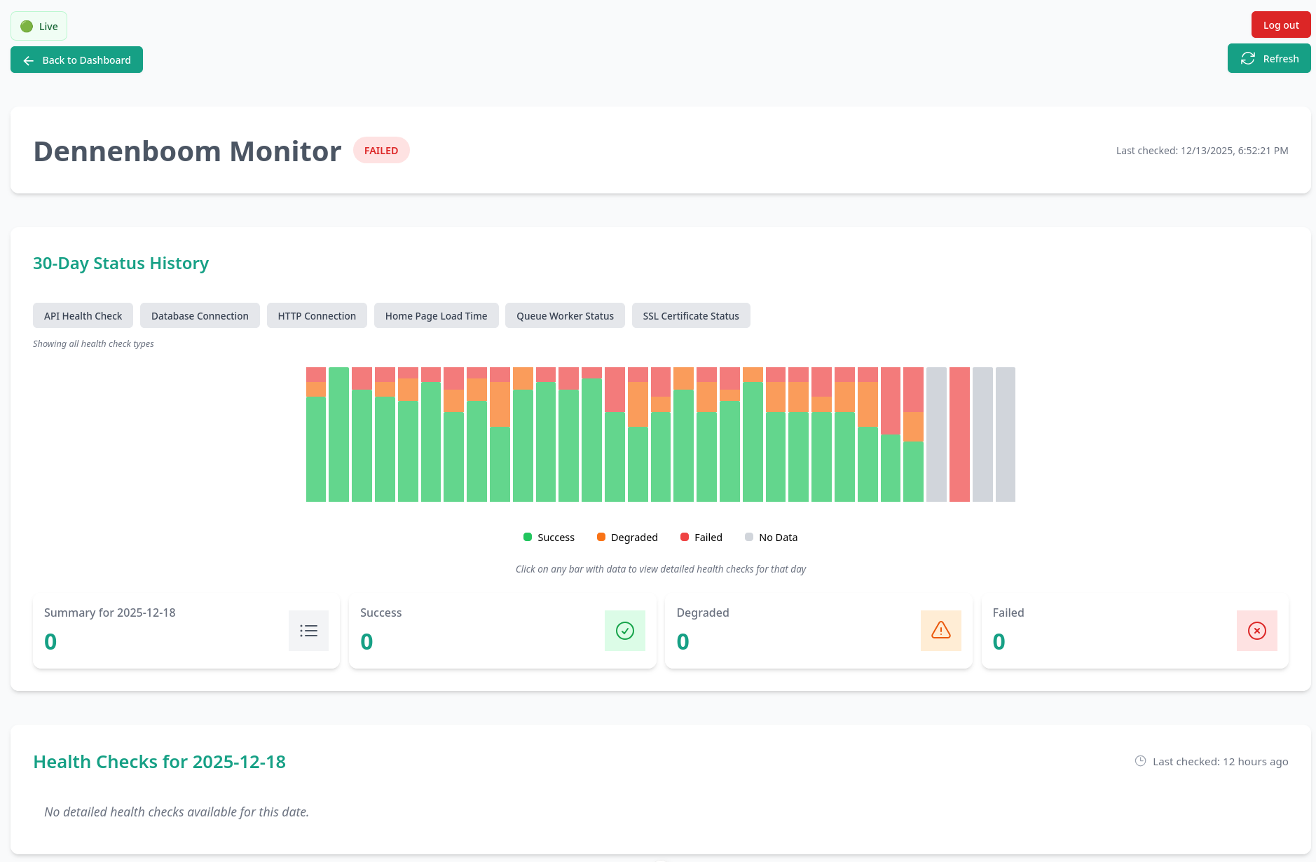 - Snel inzicht geven in foutmeldingen via interactieve charts, zoals 30-dagen-overzichten en specifieke healthchecks